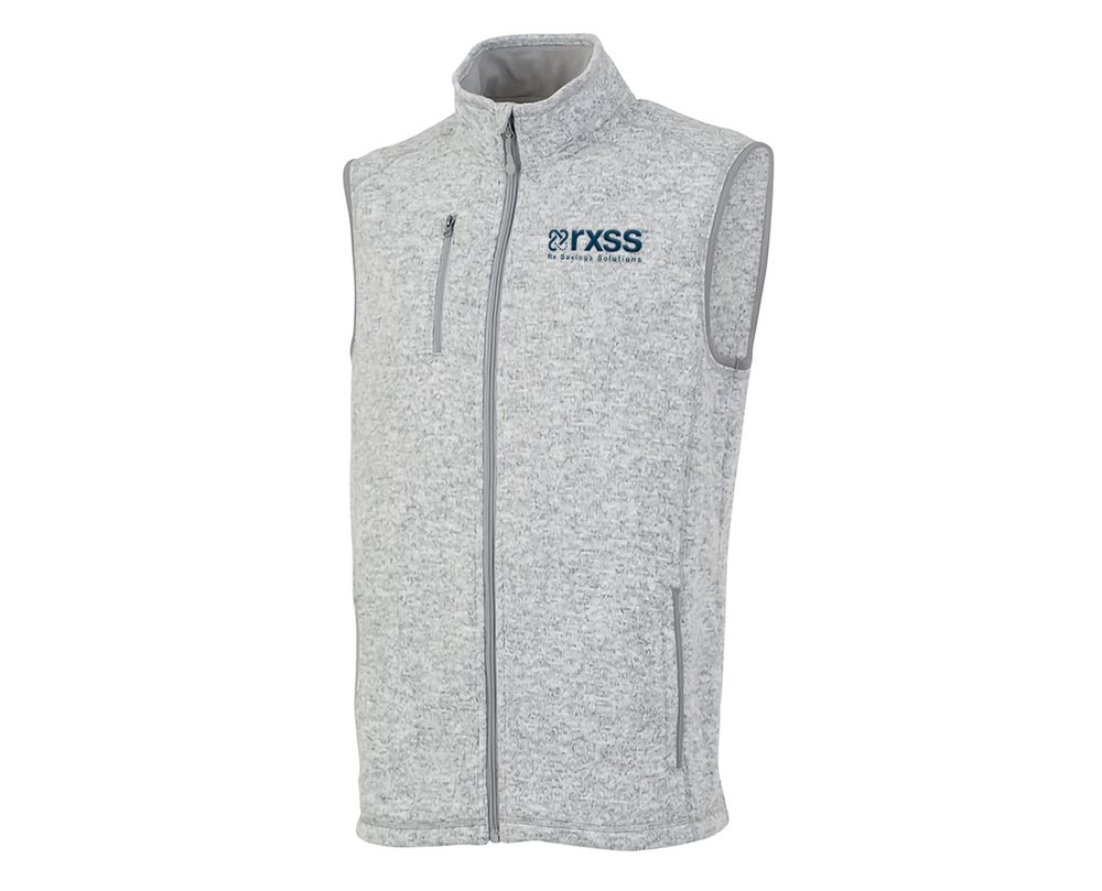 sku: RX-HR05Made of 100% polyester sweater fleece, the Charles River Apparel® Mens Pacific Heathered Vest is brushed on the inside for added softness and warmth. The knit binding adds a unique design detail while interior wind flap adds comfort. It is an ideal multi-seasonal transitional piece that layers well over just about anything. The Mens Pacific Heathered Vest also features a chest pocket with vertical zipper for easy access, double needle stitching for durability, and a stand up collar lined with brushed tricot for added comfort and warmth. Light Grey vest with 1-color embroidered logo in RxSS Navy.